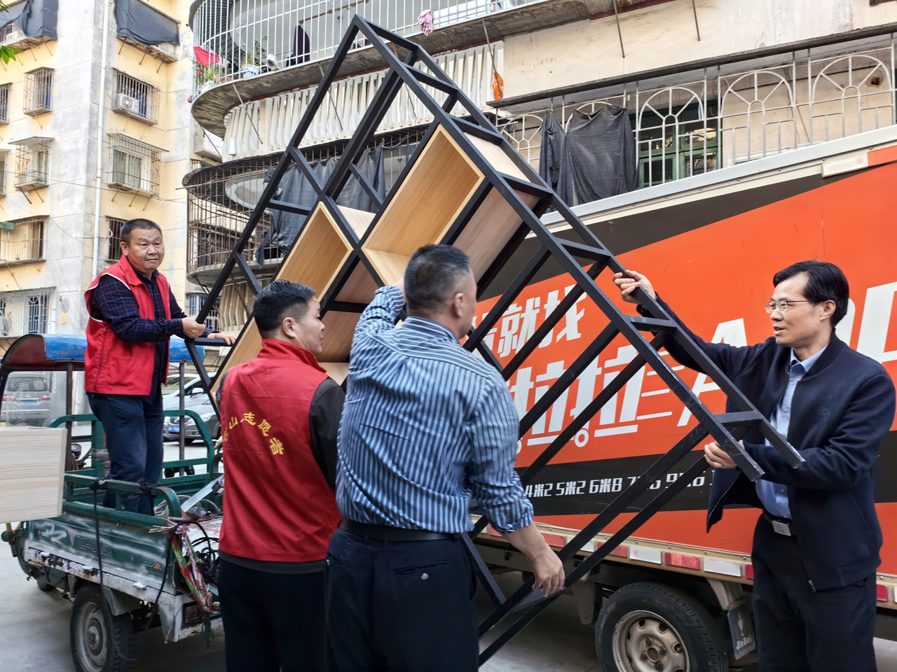 后勤保障处党支部了解到社区需求,立即组织全体党员寻找合适并可再利用的旧桌椅书柜,携手搬运到社区中,解决社区实际需求,改善社区环境,让社区工作者感受到来自近邻单位的关心支持,进一步深化近邻党建,走好新时代党的群众路线,形成党群同心共建幸福家园的美好氛围。
