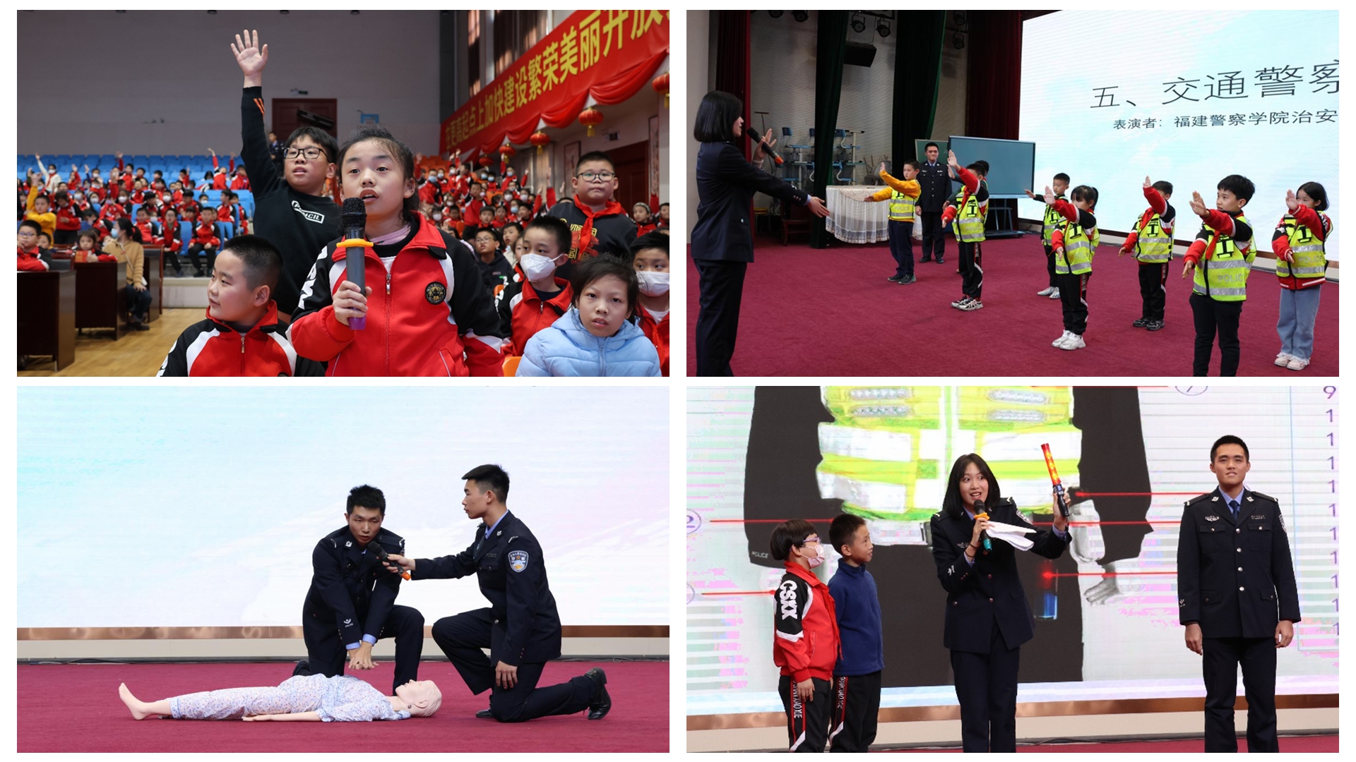 本次宣讲内容包含道路交通安全讲座、交通警察手势信号表演、交通事故现场急救展示、电动车安全歌曲、交通安全知识抢答等五个环节。宣讲团通过通俗易懂的讲座、活泼有趣的歌曲、生动形象的表演和实际操作的亲身体验为同学们普及了交通安全知识、交通警察的工作和执法装备等,每个环节都得到同学们的积极参与,现场气氛十分热烈。