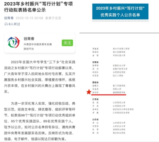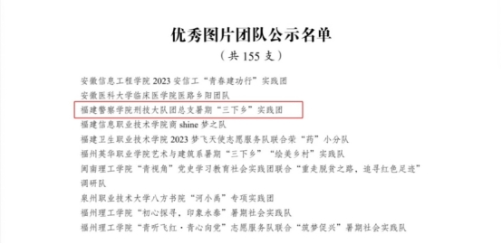 刑执大队“瓷行农情·绿意”乡村振兴实践团队队长林均宇同学入选“笃行计划”专项行动“优秀实践个人”,将代表福建省参加“笃行计划”专项行动总结活动并进行成果展示和现场介绍。全国共有89名先进个人获得该项荣誉,其中福建省有3人。同时,刑技大队团总支暑期“三下乡”实践团获评“优秀图片团队”,全国共有155支团队荣获该项荣誉。