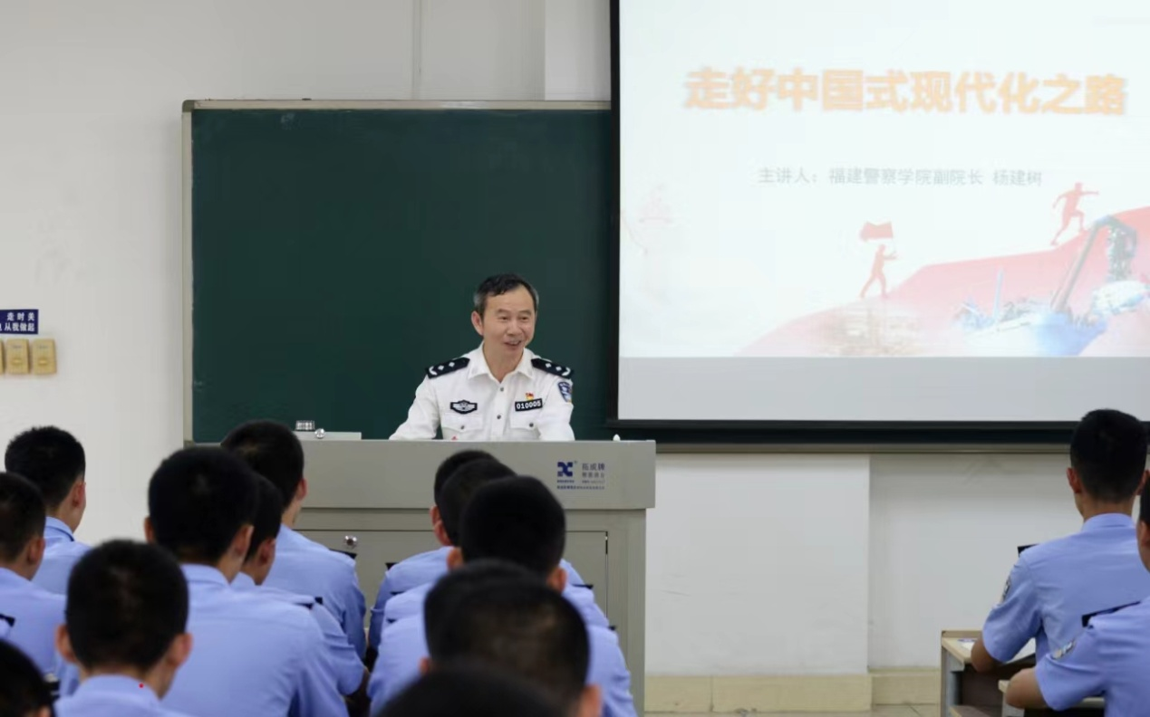 杨建树副院长以“走好中国式现代化之路”为题,从什么是中国式现代化、中国式现代化必须牢牢把握的五个重大原则、中国式现代化新征程上警院学子的使命与担当等三个方面,阐述了中国式现代化的深刻内涵,让学生更好地认识中国式现代化的独特性和价值意义。他强调,中国式现代化理论是习近平新时代中国特色社会主义思想的最新发展,推进中国式现代化是一个系统工程,希望警院学子牢记习近平总书记“对党忠诚、服务人民、执法公正、纪律严明”总要求,不断提高自身素质和能力水平,着力锻造“四个铁一般”的公安铁军,为实现中国式现代化贡献力量。