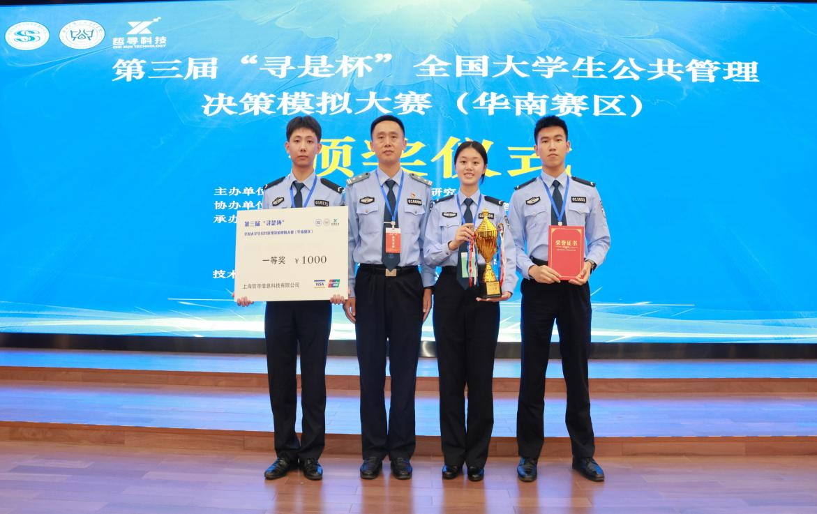 4月28日,由公安管理系教师王伟、余晓青作为指导教师,詹俊壕、林彦辰、李智璇等三名学生组成的学生团队在第三届“寻是杯”全国大学生公共管理决策模拟大赛(华南赛区)中荣获一等奖。