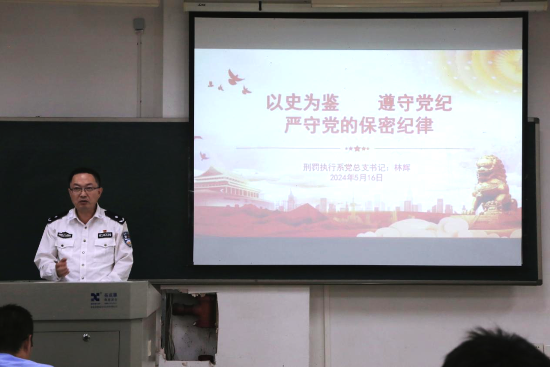 为扎实推进党纪学习教育,帮助师生党员更好理解党史、党规中的保密要求,树立良好的保密意识和法纪意识,5月16日,刑罚执行系党总支书记林辉为师生党员和入党积极分子讲授“以史为鉴、遵守党纪,严守党的保密纪律”专题党课。
