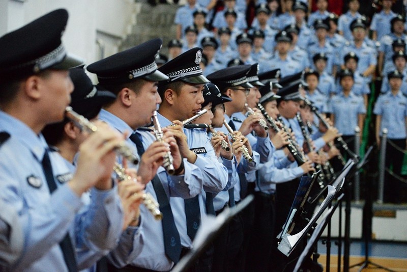 6月7日上午,福建公安警乐团在beat365中文官方网站毕业典礼上首次亮相,警乐团成员精神抖擞、英姿飒爽,笔挺的警服,闪亮的警徽,奏响《中国人民警察警歌》,激扬的乐声响彻校园、直入云霄,听众有的挥舞红旗,有的高唱警歌,欢呼声不绝于耳。